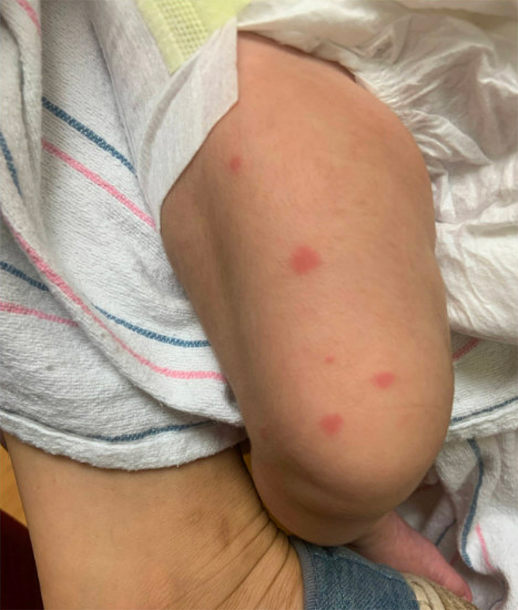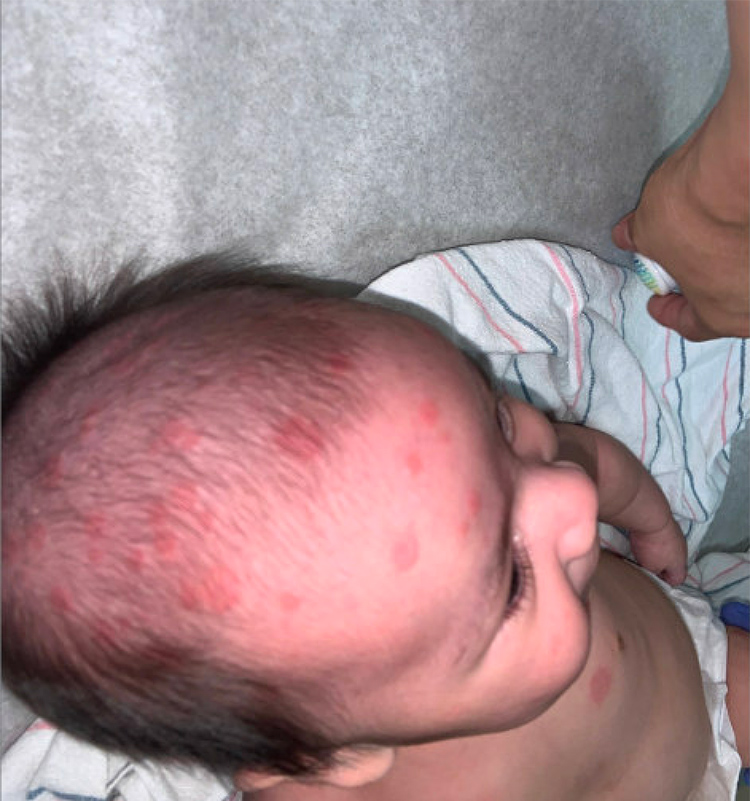 We present the case of a 6-week-old male born at full term (40 weeks and 5 days) to a 37-year-old G2P2 mother via normal vaginal delivery, with APGAR scores of 9 at both 1 and 5 minutes. The infant’s medical history was unremarkable until he presented to his pediatrician with a one-week history of rash. The rash initially appeared on the face and later spread to the head, arms, trunk, legs, and diaper area. The lesions remained unchanged since their onset. The patient had no history of fever or upper respiratory symptoms. The mother was breastfeeding and supplementing with formula. She reported switching the formula about a week before the rash developed, but no other changes in the patient’s oral intake were noted. No other household members had a similar rash.