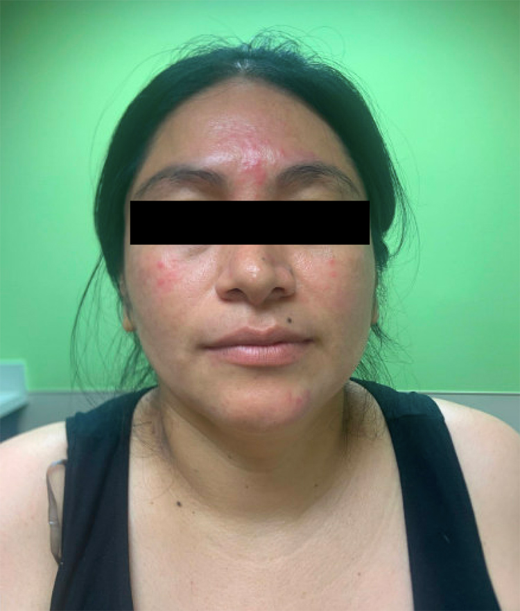 The appearance of the rash prompted the clinician to investigate the mother’s medical history further, revealing that she had an undiagnosed facial rash since 2014 (Figure 4) and a history of carpal tunnel syndrome. Neonatal lupus emerged as the leading differential diagnosis, prompting anti-SSA/Ro and anti-SSB/La antibody testing. Other differentials were considered, including papular eczema and scabies/mite infestation. However, scabies/mites were deemed less likely due to the absence of symptoms in other family members and the lack of resolution in the lesions.
